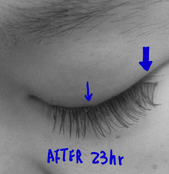 為了實驗可以多牢靠,所以特地整晚不拔睫毛(好孩子千萬不要學啊)。經過23hr,眼尾終於彈跳了。