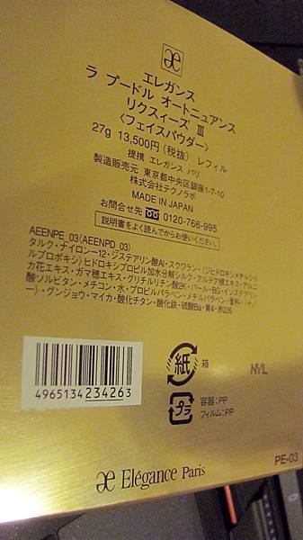 ELEGANCE自從撤出台灣以後,要買他們家的產品也變得極度麻煩。不含殼13500元日幣未稅,而且不能退稅,不過還好遇到的日本櫃姊給試用品蠻大方的,抓了一把就往袋子裡塞,可能是要彌補她完全不會講英文讓我用比手畫腳結帳的遺憾。